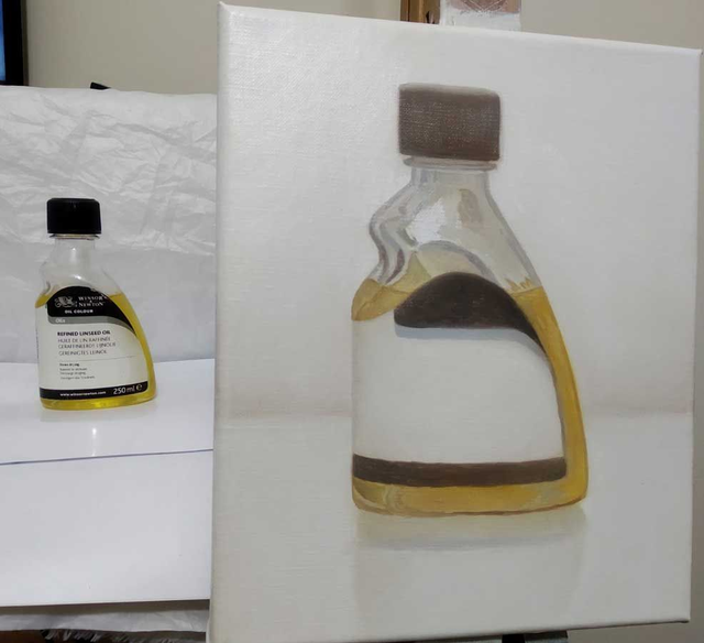 Linseed Oil - This is a painting in Oil on linen. It was exhibited in my solo exhibition in the Artisann Gallery in Belfast 2021. It was part of the "Artefacts of a Pandemic" show that I put on. It was on exhibition amongst 25 other paintings. These paintings are all framed in a white float moulding. It is sized at 25 x 30cm and comes framed in a white moulding.