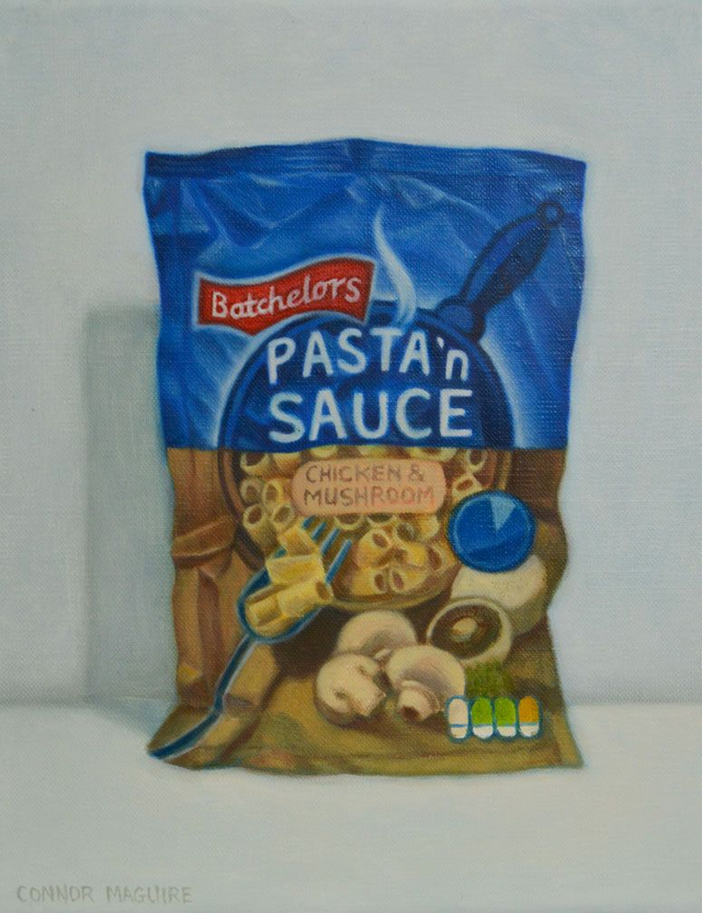 Pasta n Sauce - This is a painting in Oil on linen. It was exhibited in my solo exhibition in the Artisann Gallery in Belfast 2021. It was part of the "Artefacts of a Pandemic" show that I put on. It was on exhibition amongst 25 other paintings. These paintings are all framed in a white float moulding. It is sized at 25 x 30cm and comes framed in a white moulding.