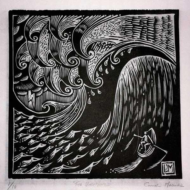 Woodcut printed on Fabriano paper 20cm x 20cm. Edition of 10 signed and titled by Connor Maguire {Last one and Artist Proof or available} Posted rolled in a tube as print only.